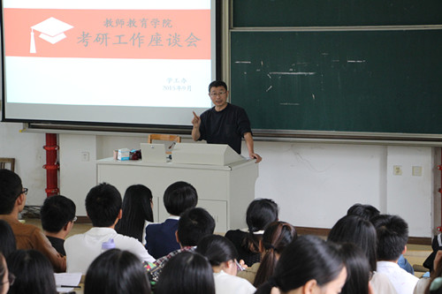 会议围绕“分享”和“寄语”两大主题展开,我们报名参加2016年全国硕士研究生招生考试的50名学生针对备考过程的问题与经验,向大家分享了备考至今的心路历程及复习的经验与教训,也对现阶段的教师资格考试、毕业论文、实习与考研冲突的事情表达了自身的困惑。贵院长针对同学们目前的困惑与问题给予了实际的答复,给所有考研学生创造更加利于备考的环境。此外,他还指出考研需要具备“三信”,即信念、信心、信息。他引导坚定信念、树立信心、掌握信息,进行科学有效地复习。最后,丁静老师以她的亲身经历鼓励在场同学们坚持到底,并为考研学子送上了真挚祝福。 (文/蒋杨烨 摄/蔡瑜斐)