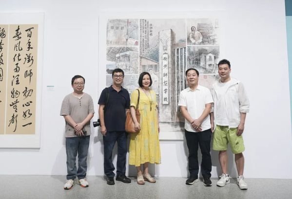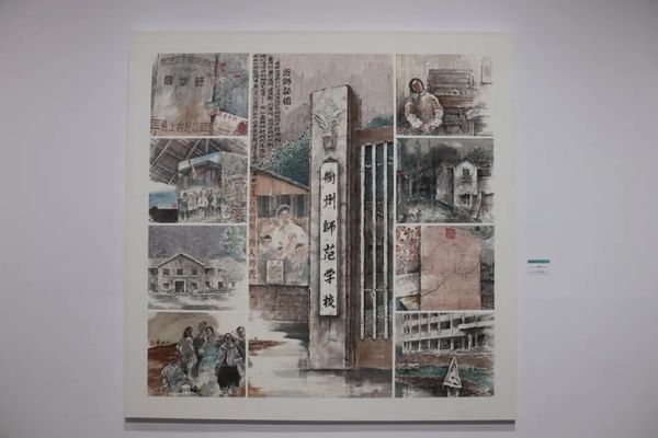 书画展区以“衢师艺花已绽放”为主线,展出了82件衢师人的绘画、书法佳作。93岁高龄的许铁铮老先生仍坚持创作,其山水画作品《仙霞山居图》展现出蓬勃的艺术生命力;陈民新创作的大型画作《衢师记忆》以校牌为主体,融合师生形象与风琴房等元素,构筑出师范教育的视觉丰碑;朱建华的《艺梦启程·八八纪》用速写记录了1988届美术兴趣小组的师生情谊;叶云龙笔下的苏式教学楼与周保平的菱湖记忆,从建筑与景致的角度寄托了深厚的母校情怀;阮渭平根据一张黑白老照片,以细腻的笔触重现了当年师生们每天必经的讲舍街8号的街道和校门。